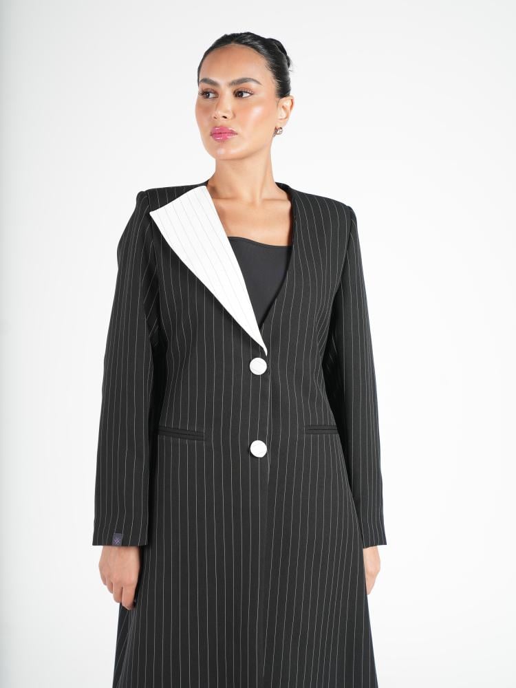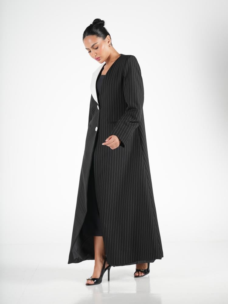 عباية بليزر أنيقة بتصميم متقن وتفاصيل مميزة، مزينة بتداخل اللون الأبيض المقلم على قماش الكتان.