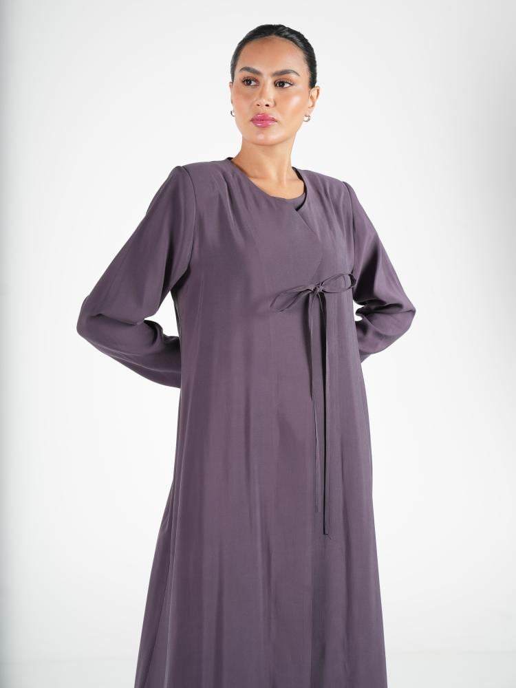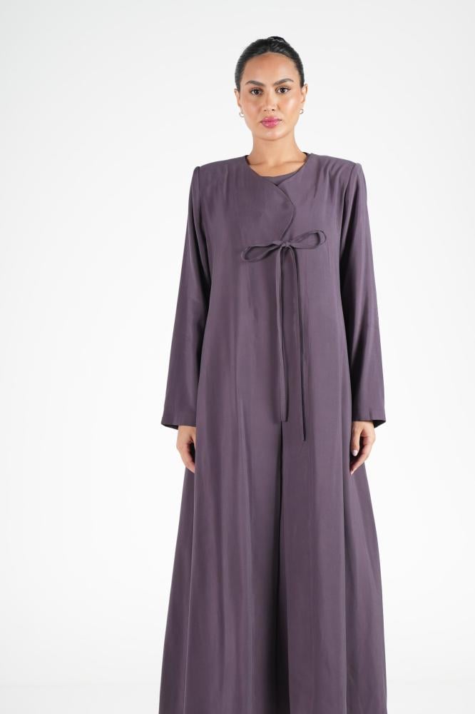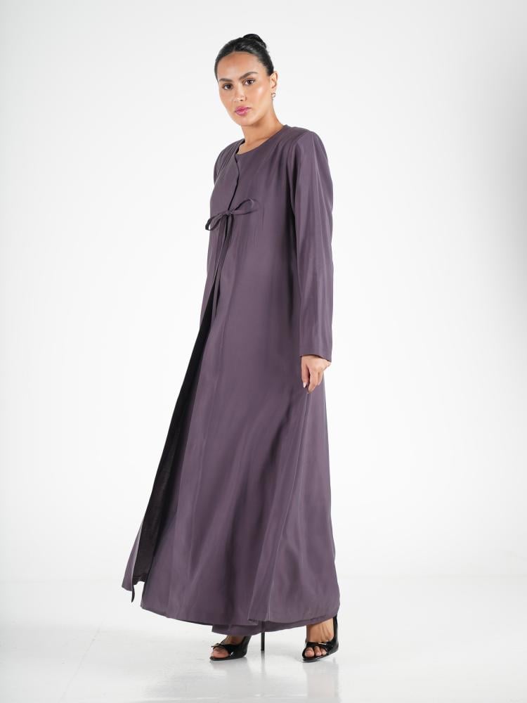 عباية أنيقة بلون بنفسجي غامق متفرد، مصنوعة من قماش كريب مغسول بانسياب يلامس الخفة والفخامة.