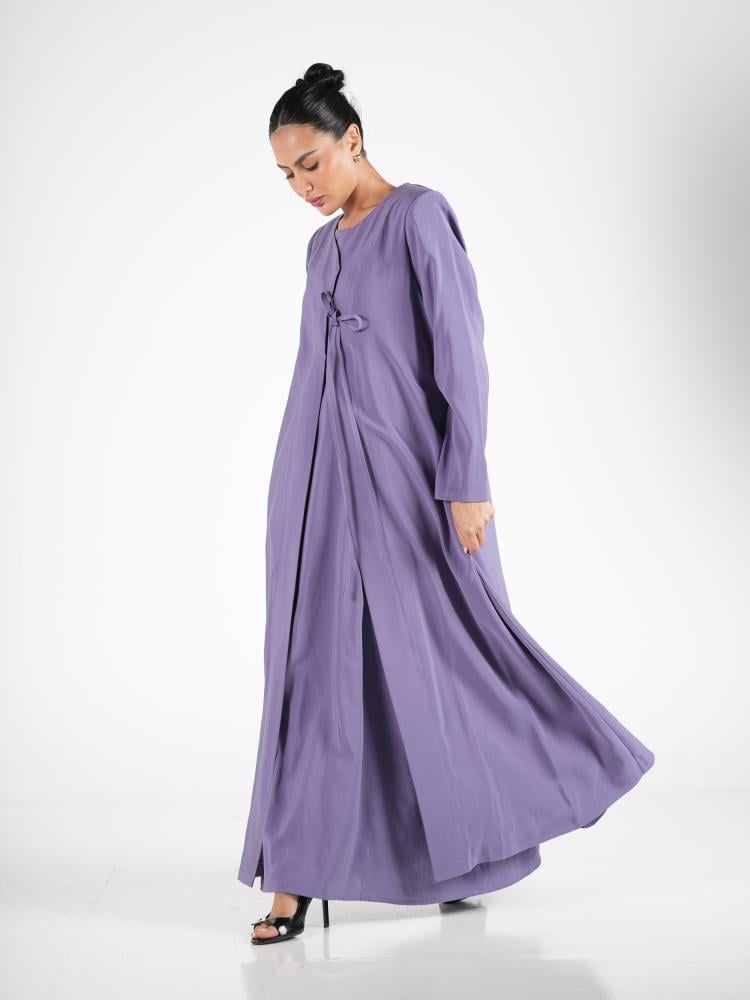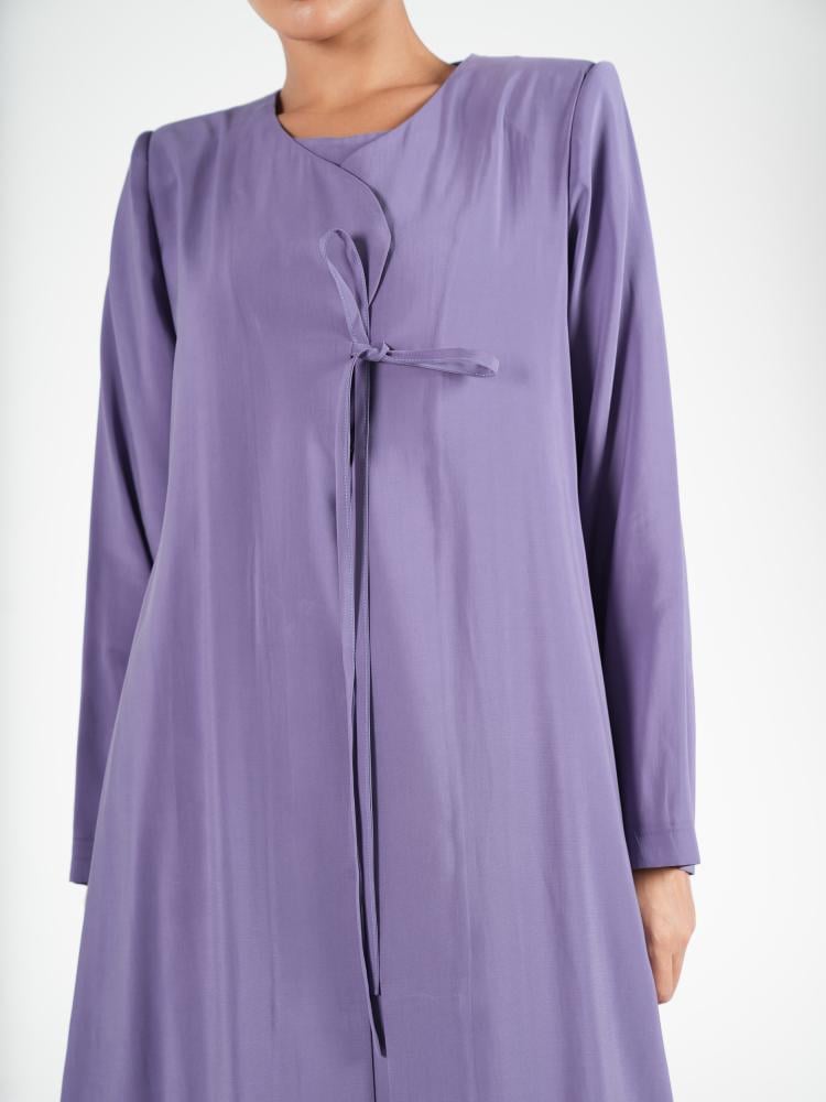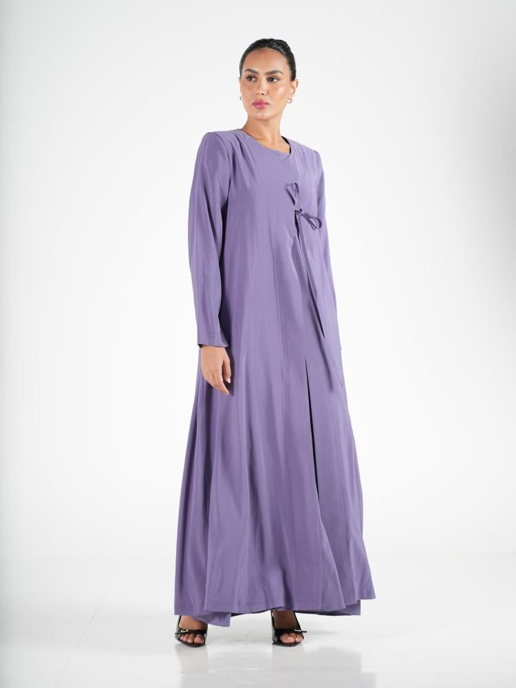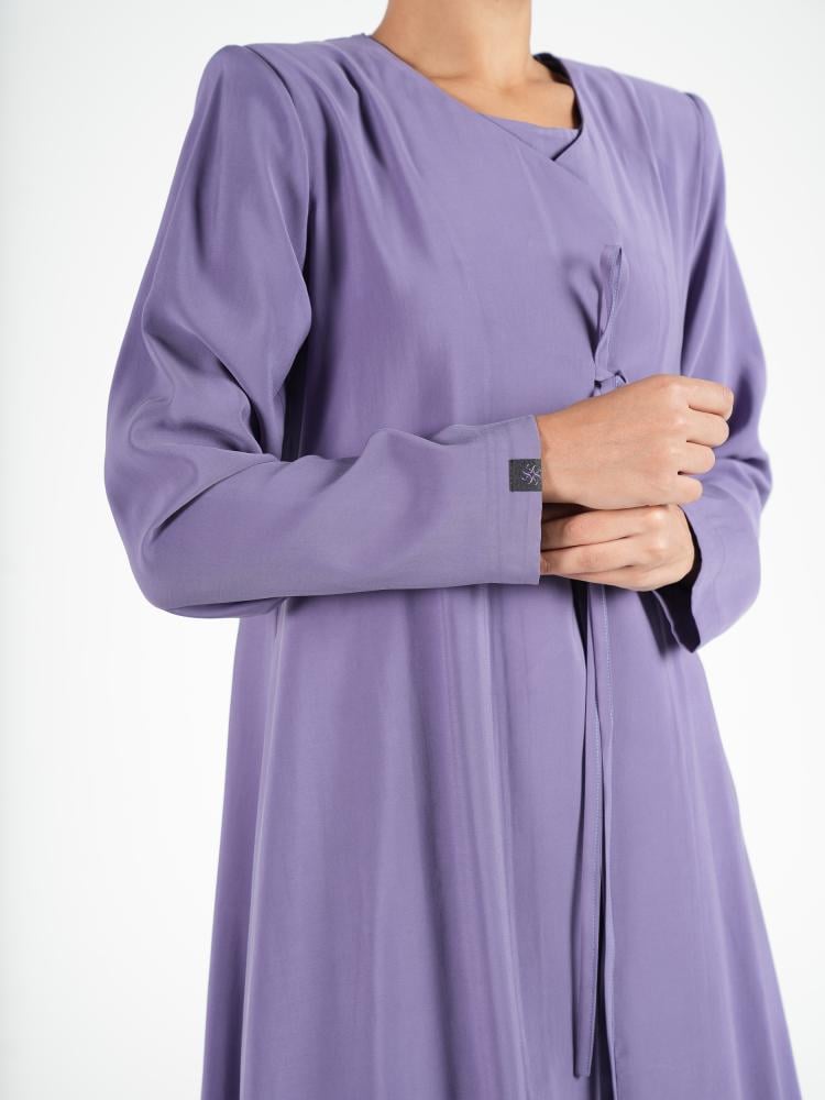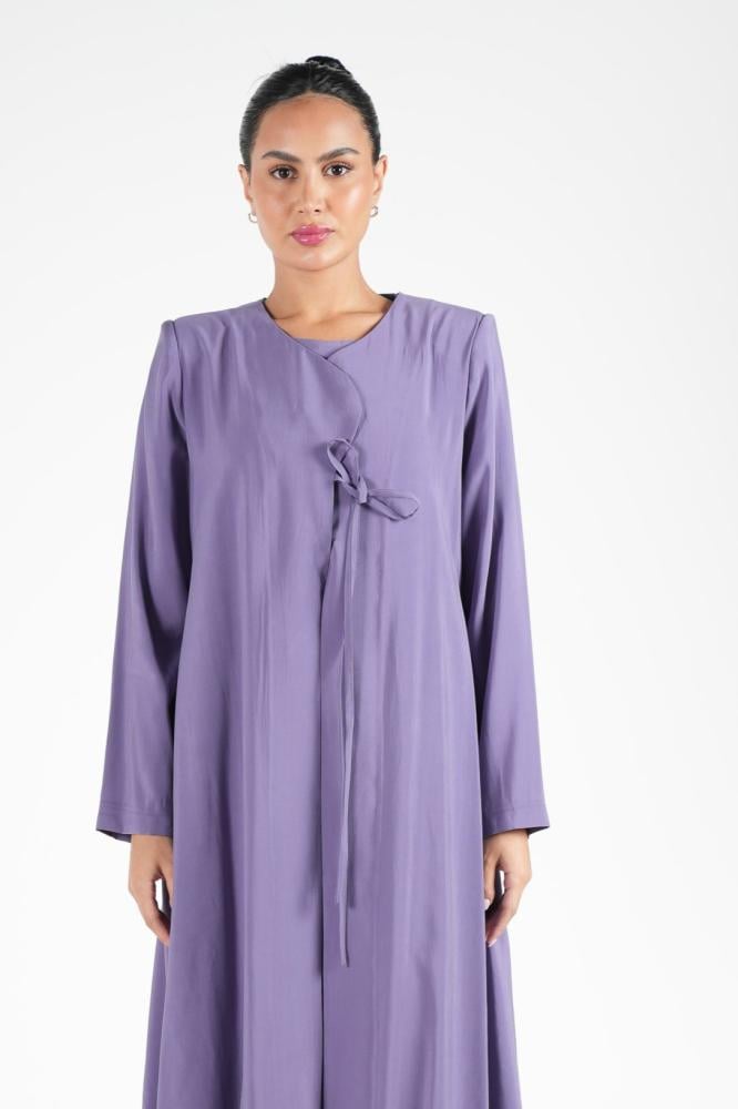 عباية أنيقة بلون عيناوي متفرد، مصنوعة من قماش كريب مغسول بانسياب يلامس الخفة والفخامة.