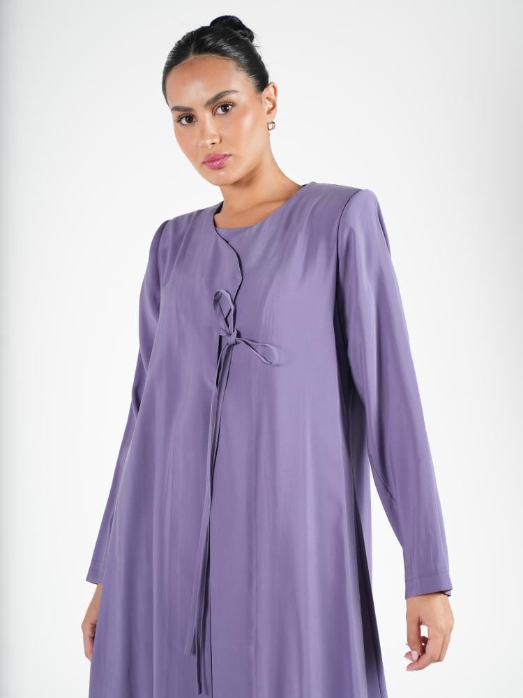 تتألق العباية بـ كتافات أنيقة تمنح التصميم حضورًا متوازنًا يجمع بين العصرية والكلاسيكية. يكتمل الإطلالة مع فستان داخلي ناعم ليخلق تناغمًا أنثويًا أنيقًا لا يُقاوم.